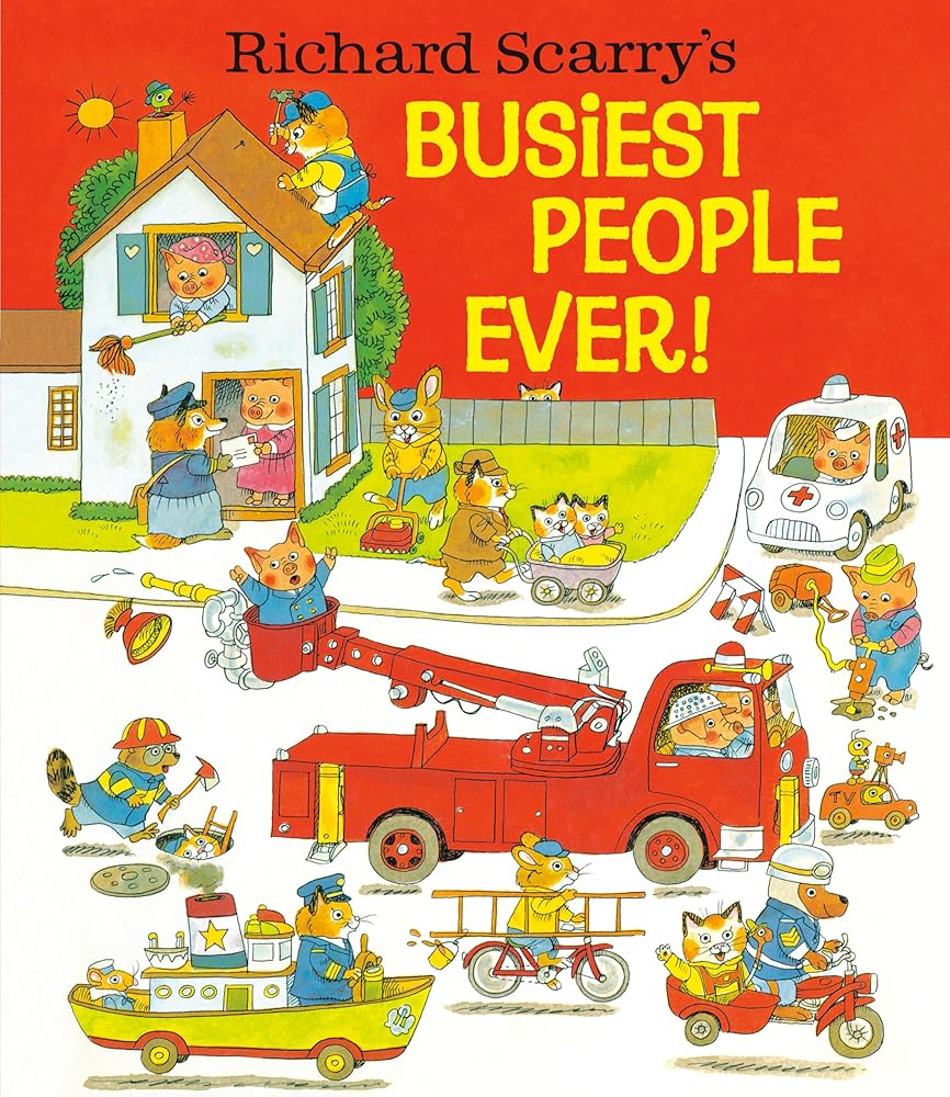 Back in print after twenty years! Now readers can once again follow all the busy people who keep Busytown running smoothly. Everyone’s favorite friends are there: Huckle Cat, Lowly Worm, Sergeant Murphy, bumbling Mr. Frumble, and more. Preschoolers learning about their communities will enjoy seeing the inner workings of a farm, the harbor, the airport, and even the busy Cat household! This classic book, from the one and only Richard Scarry, will bring hours of fun to a whole new generation.